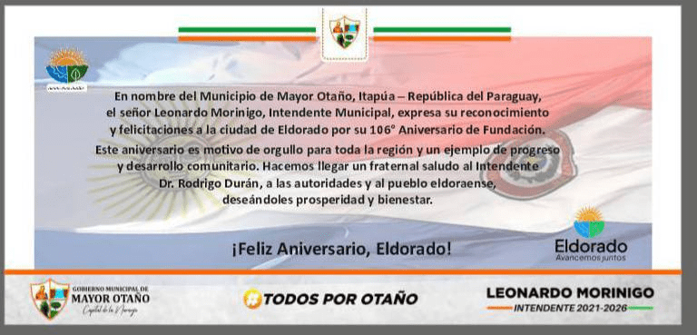 29 de septiembre de 2025 – En representación de la Municipalidad de Mayor Otaño y la administración del Intendente Leonardo Morínigo, extendemos nuestras más sinceras felicitaciones a la ciudad de Eldorado en la conmemoración de su 106° Aniversario de Fundación.