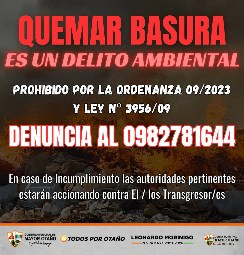 La Municipalidad de Mayor Otaño, bajo la administración del Intendente Leonardo Morinigo, informa a toda la ciudadanía sobre la vigencia de las normativas ambientales que restringen el manejo inadecuado de residuos.