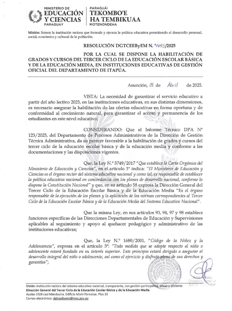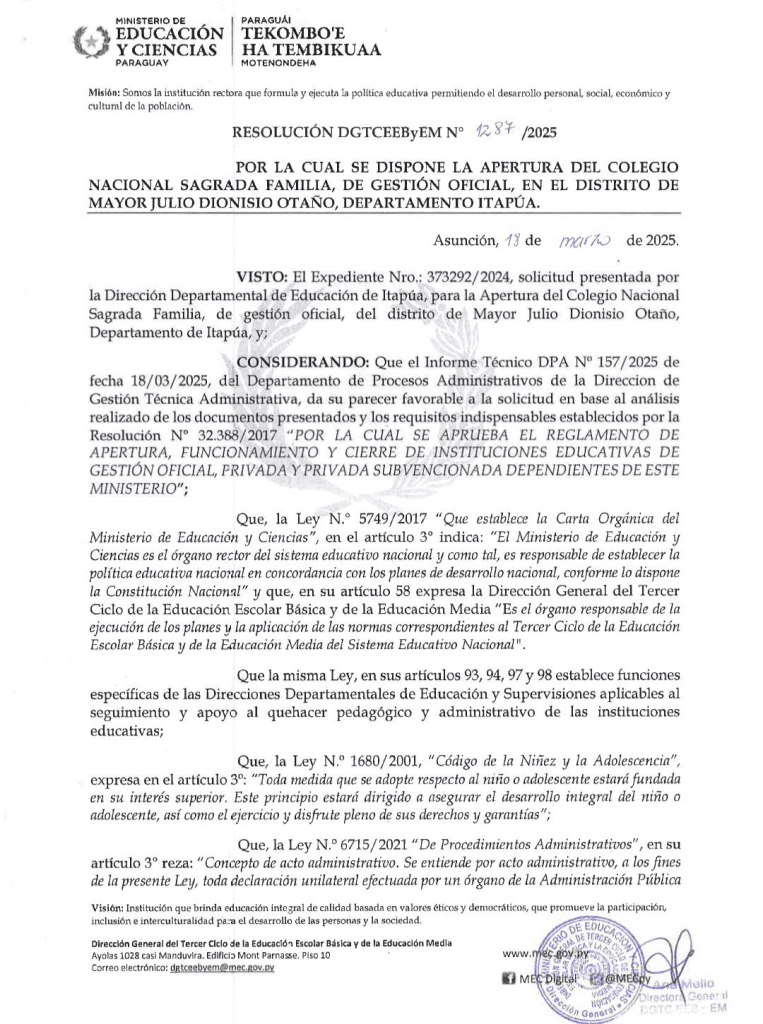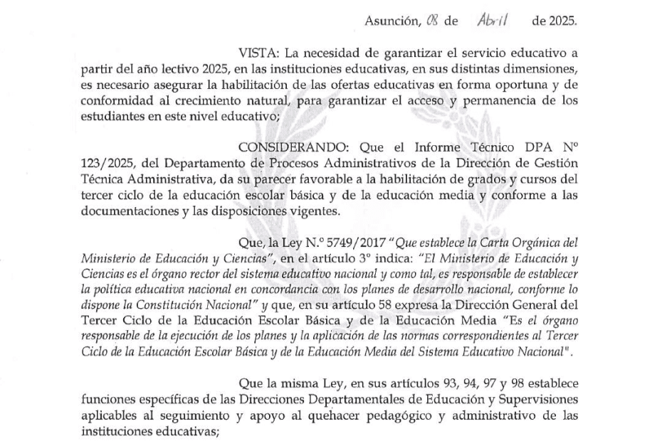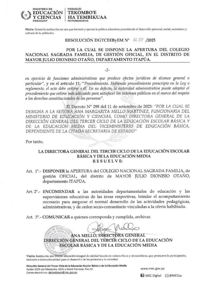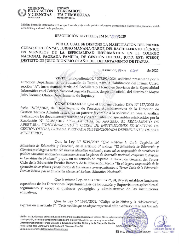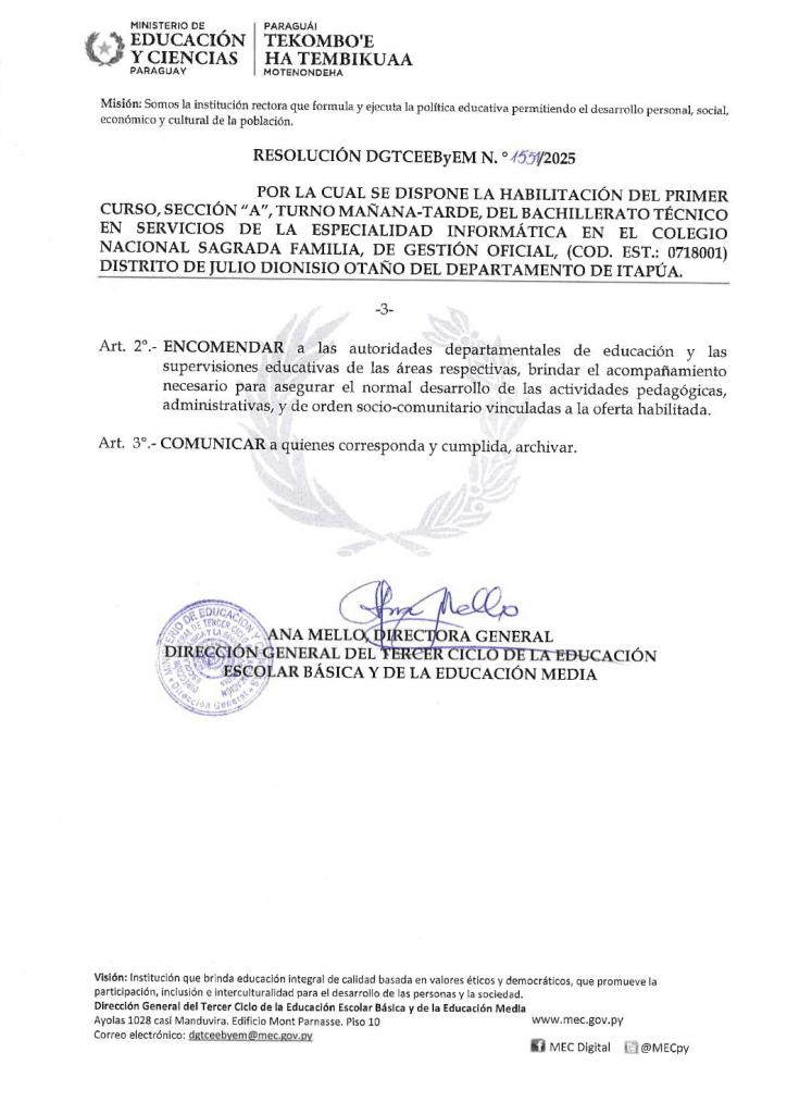 A través de la Resolución N° 1287/2025, se dispone la apertura del nuevo Colegio Sagrada Familia. En sus instalaciones, iniciará el Bachillerato Técnico en Informática, una especialidad clave para dotar a los jóvenes de herramientas tecnológicas competitivas para el mercado laboral actual.