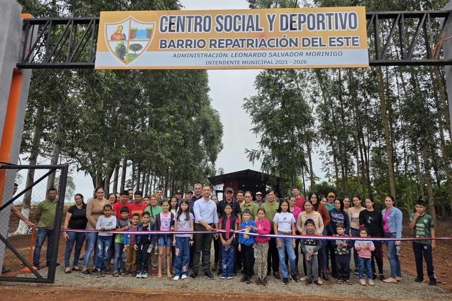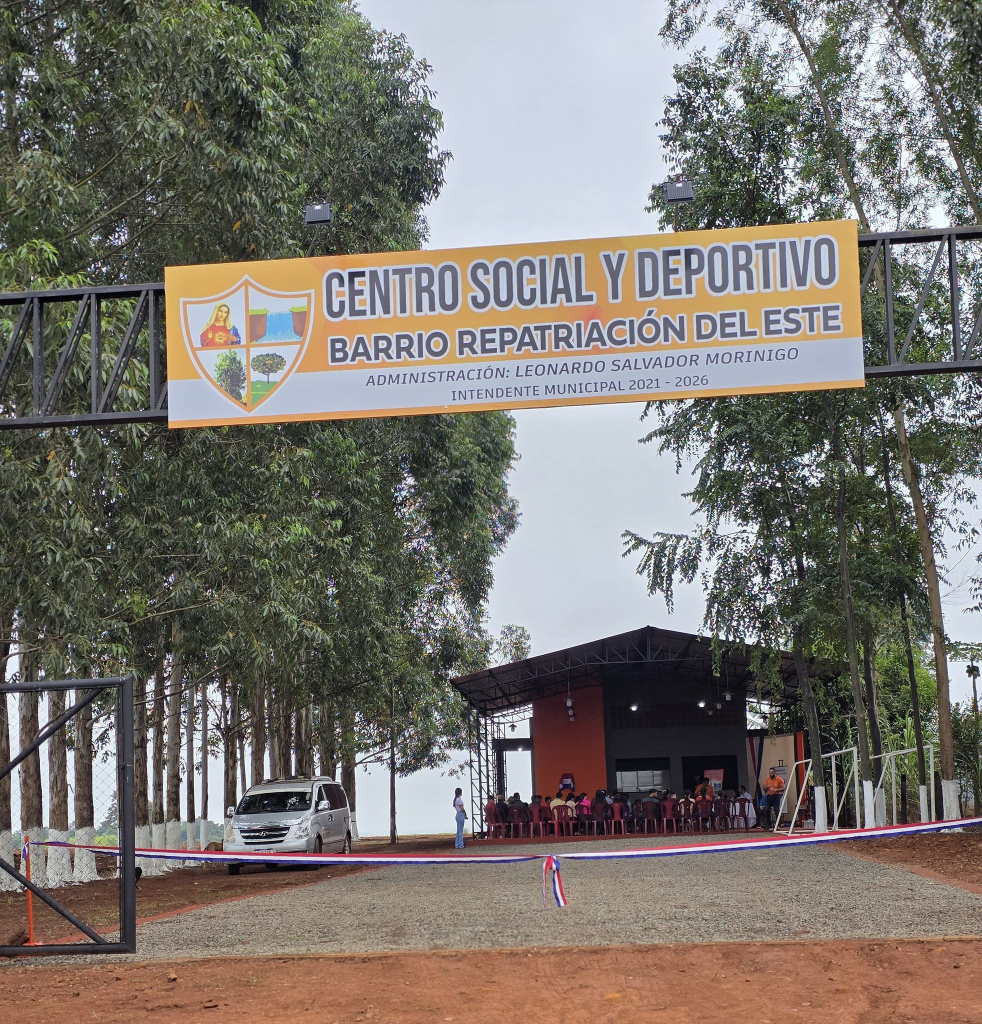 26 de abril de 2025 – Con el objetivo de fortalecer el tejido social y promover hábitos de vida saludables, la Municipalidad ha inaugurado oficialmente el nuevo Centro Social y Deportivo del Barrio Repatriación del Este. El evento fue encabezado por el Intendente Municipal, Sr. Leonardo Morínigo, acompañado por los concejales Sr. Fabio Bogado, Sra. Elizabeth Brítez, Sr. Alberto Chaparro y Sr. Ramón Morán.