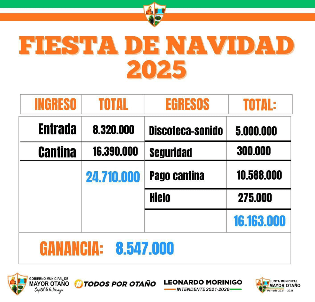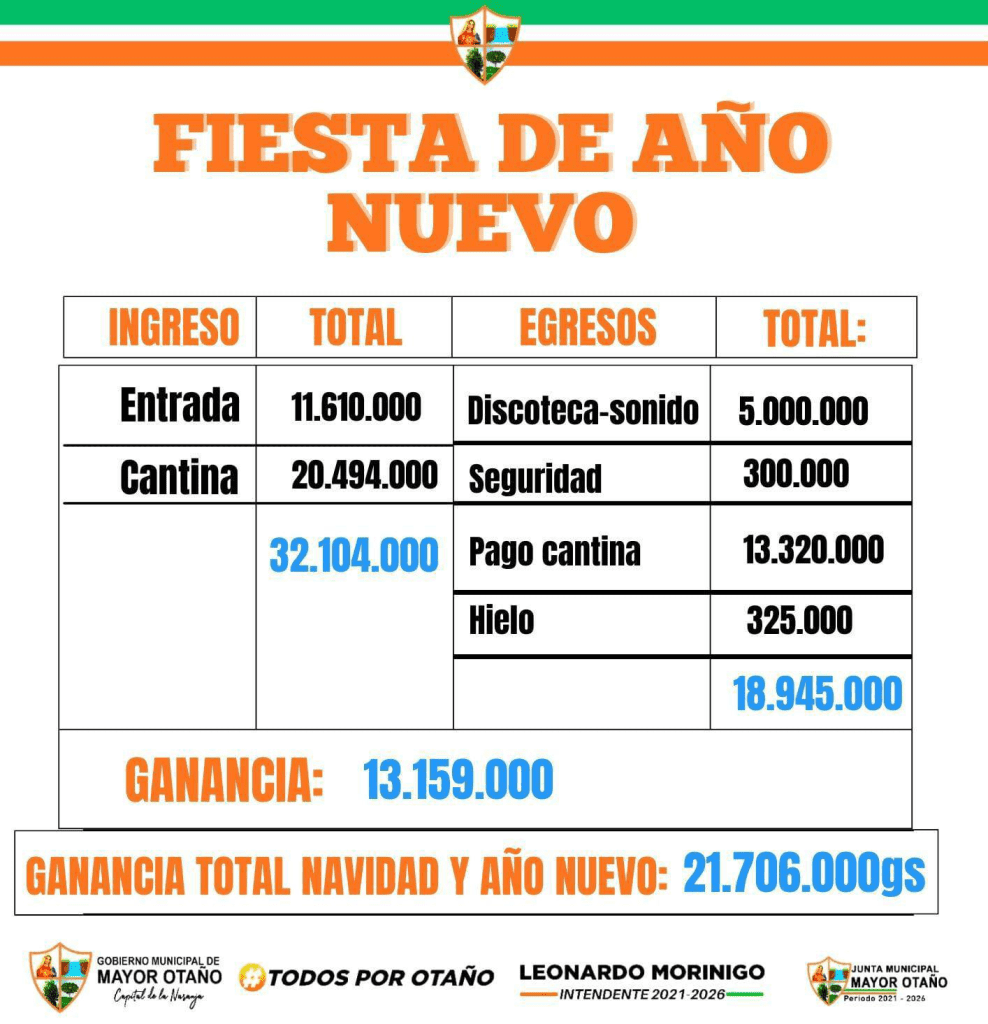 En cumplimiento con el principio de transparencia que rige a esta administración, el Intendente Municipal Leonardo Morínigo presenta el balance oficial de las actividades realizadas durante las celebraciones de Navidad y Año Nuevo en nuestro distrito.