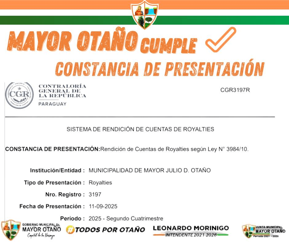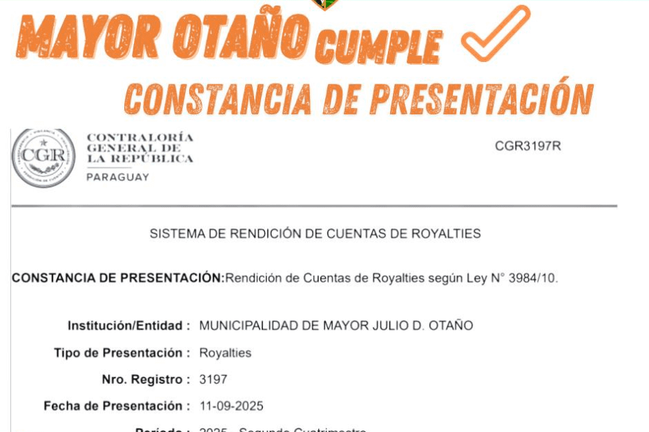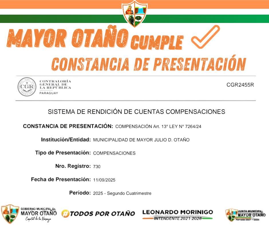 12 de septiembre de 2025 – La Municipalidad de Mayor Otaño informa a la opinión pública y a los organismos de control que se ha cumplido, en tiempo y forma, con la presentación de la rendición de cuentas correspondiente al Segundo Cuatrimestre del Ejercicio Fiscal 2025.