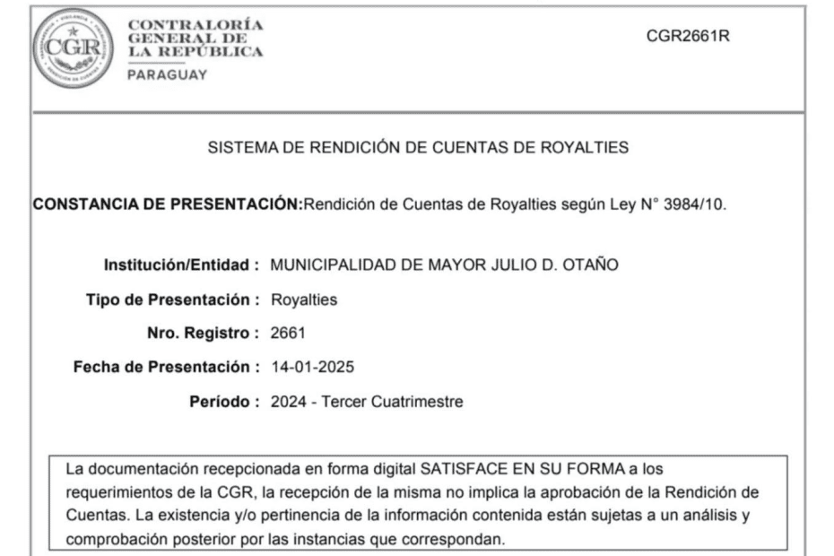 La Municipalidad de Mayor Otaño, liderada por el Intendente Leonardo Morinigo, ha presentado de forma puntual ante la Contraloría General de la República la rendición de cuentas del Tercer Cuatrimestre del Ejercicio Fiscal 2024.
